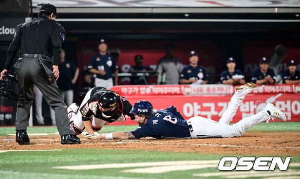 KT 포수 장성우가 6회초 2사 1,2루에서 두산 박준순 안타 때 케이브를 홈에서 태그아웃 시키고 있다. 2025.09.09