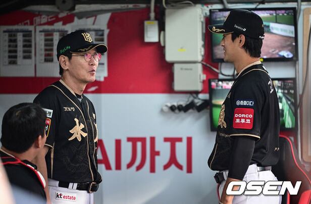 KT 이강철 감독이 경기를 앞두고 고영표와 대화를 나누고 있다. 2025.09.09