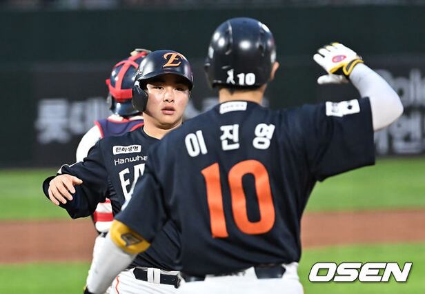 한화 이글스 문현빈이 1회초 2사 2루 채은성의 중견수 앞 안타때 득점을 올리고 있다. 2025.09.10