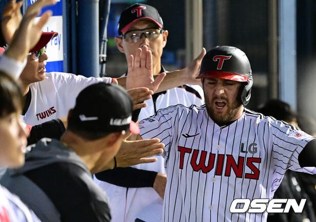 3회말 1사 1,3루 LG 김현수가 1루수 맞는 내야 안타로 타점을 올렸다. 이때 득점을 올린 오스틴이 염경엽 감독의 환영을 받고 있다. 2025.09.11