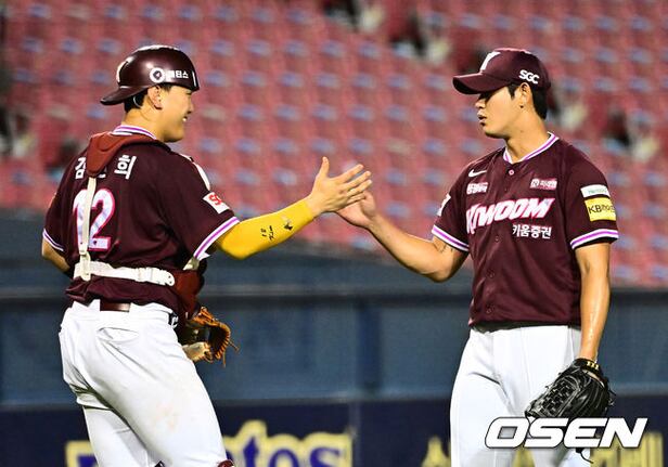 경기를 마치고 키움 김건희, 조영건이 승리를 기뻐하고 있다. 2025.09.17