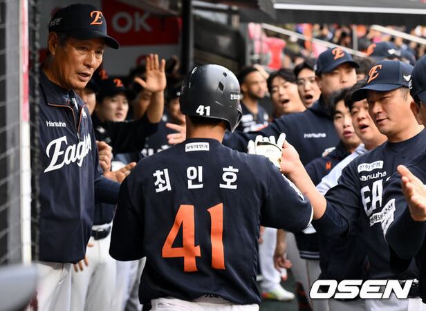 1회초 무사 2,3루 한화 최인호가 KT 오원석을 상대로 선제 3점 홈런을 날린 뒤 더그아웃에서 환영을 받고 있다. 2025.10.03