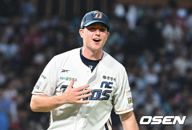 NC 다이노스 선발투수 라일리가 4회초 2사 3루 SSG 랜더스 임근우를 투수 땅볼로 잡고 실책을 했다고 생각하고 놀라고 있다. 2025.10.04