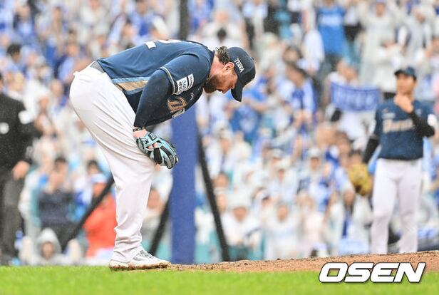 NC 다이노스 로건이 1회말 2사 만루 삼성 라이온즈 강민호에게 밀어내기 볼넷을 허용하고 아쉬워하고 있다. 2025.10.07
