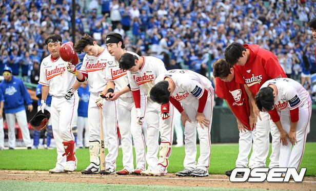 경기 종료 후 SSG 선수들이 관중석을 향해 인사를 하고 있다. 2025.10.09