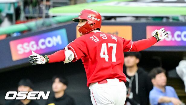 9회말 SSG 김성욱이 끝내기 홈런을 날린뒤 기뻐하고 있다. 2025.10.11