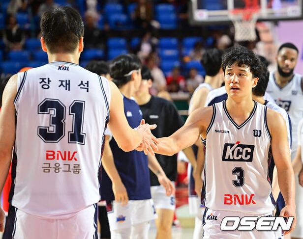 경기를 마치고 KCC 허웅이 장재석과 하이파이브를 하고 있다. 2025.10.13