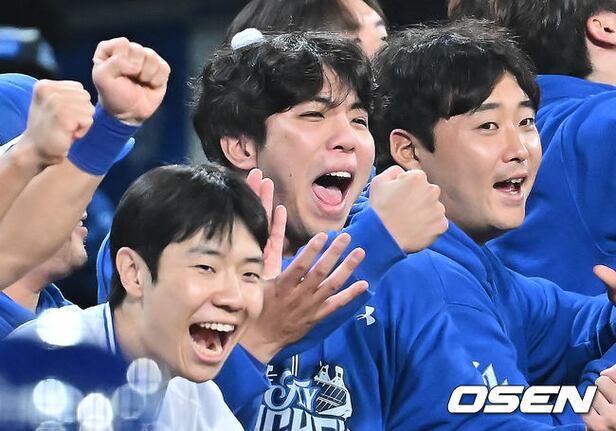 삼성 라이온즈 김영웅과 선수들이 6회말 무사 1,2루 디아즈의 좌익수 앞 안타때 비디오 판독 끝에 김성윤의 득점이 인정되자 환호하고 있다. 2025.10.14