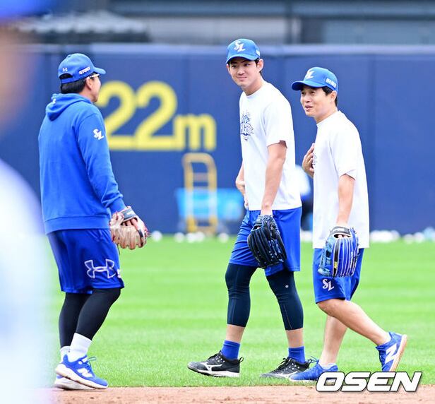 경기를 앞두고 삼성 구자욱과 김헌곤이 이종욱 코치와 훈련을 펼치고 있다. 2025.10.14