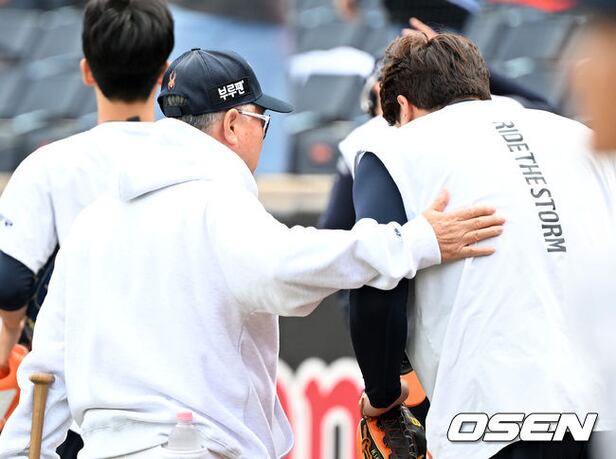 경기에 앞서 한화 김경문 감독이 류현진과 이야기를 나누고 있다. 2025.10.17 /sunday@osen.co.k
