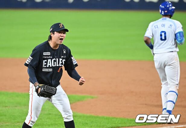 한화 이글스 김범수가 5회말 2사 1루 삼성 라이온즈 디아즈를 2루수 땅볼로 잡고 포효하고 있다. 2025.10.21