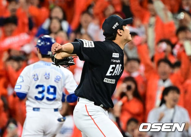 한화 문동주가 승리를 기뻐하고 있다. 2025.10.21