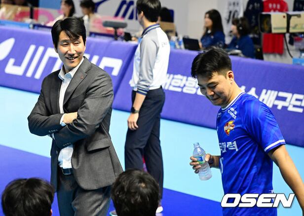 3세트 한국전력 권영민 감독이 하승우와 이야기를 나누며 미소짓고 있다. 2025.10.23