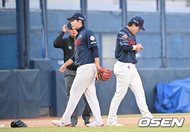 롯데 자이언츠 박찬형이 7회말 1사 1루 NC 다이노스 김명규의 타구를 잡다 손목 통증을 호소하고 있다. 2025.10.29