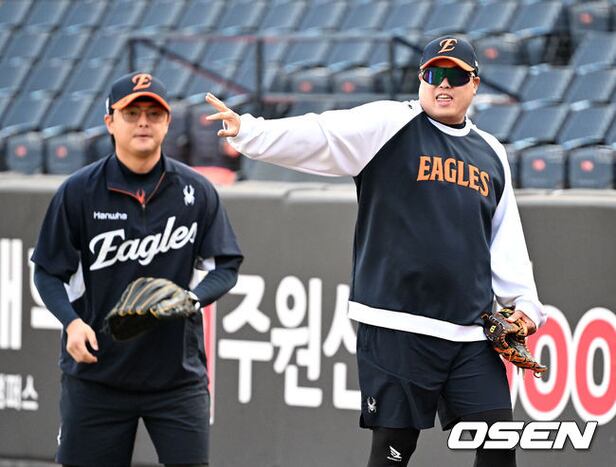 경기에 앞서 한화 류현진이 동료들의 훈련을 바라보고 있다. 2025.10.29