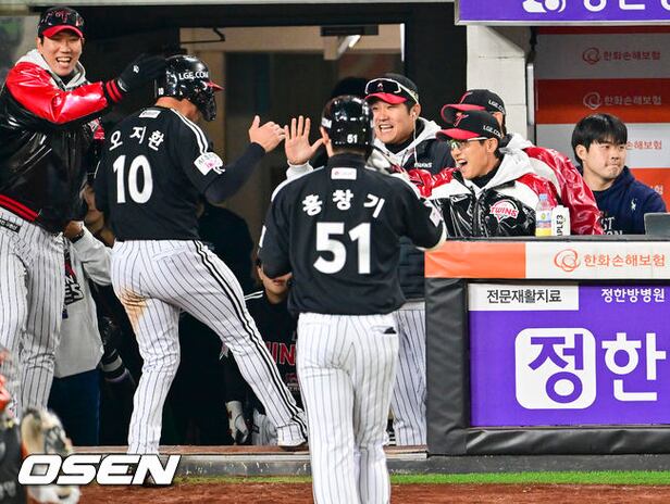 9회초 1사 만루 LG 홍창기의 희생플라이때 3루 주자 오지환이 득점 후 염경엽 감독과 하이파이브를 하고 있다. 2025.10.31