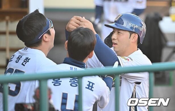 NC 다이노스 오영수가 1회말 1사 1,2루 김범준의 1타점 안타때 득점을 올리고 낚시 세리머니를 하고 있다. 2025.11.01
