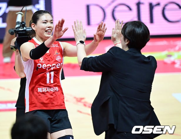 경기를 마치고 승리한 페퍼저축은행 장소연 감독과 시마무라가 기뻐하고 있다. 2025.11.13