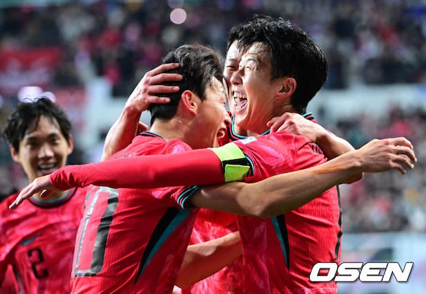 후반 한국 손흥민이 프리킥으로 선제골을 작렬시킨 뒤 동료들과 기뻐하고 있다. 2025.11.14