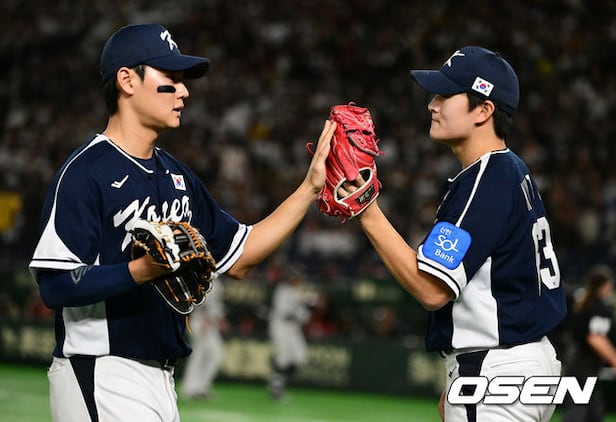 4회말 수비를 마치고 대한민국 김택연이 김주원과 하이파이브를 하며 더그아웃으로 향하고 있다. 2025.11.15.