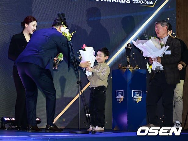 KBO 홀드상을 수상한 SSG 노경은이 가족들의 축하를 받고 있다. 2025.11.24