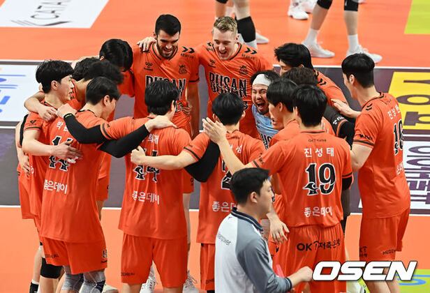 OK저축은행 선수들이 5세트 접전 끝에 승리한 후 기쁨을 나누고 있다. 2025.11.30