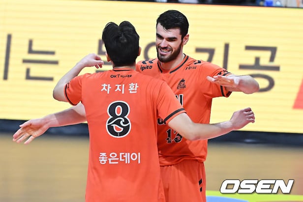OK저축은행 차지환이 득점을 성공하고 디미트로프와 기쁨을 나누고 있다. 2025.11.30