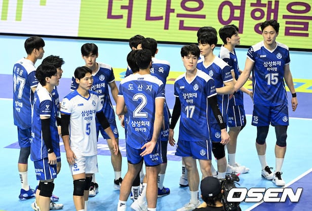경기 종료 후 삼성화재 선수들이 패배에 아쉬워하고 있다. 2025.12.07