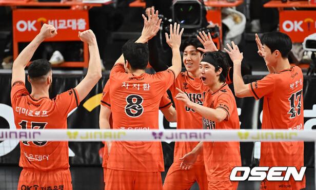 남자배구에서 파죽의 10연승을 달리는 대한항공과 '상위팀 킬러'로 통하는 OK저축은행이 외나무다리 대결을 펼쳤다.