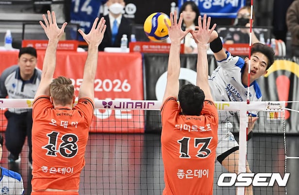 8일 부산 강서실내체육관에서 진에어 2025-2026 V리그 남자부 OK저축은행과 삼성화재의 경기가 열렸다.