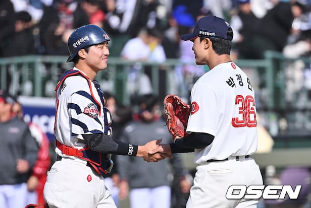 롯데 자이언츠 박정민과 손성빈이 5-3으로 승리한 후 기쁨을 나누고 있다. 2026.03.14