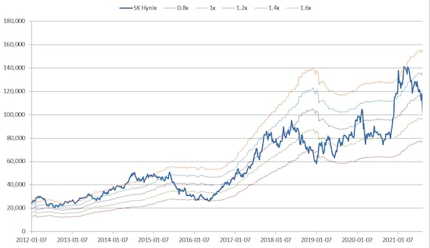 그럼 SK하이닉스는 지금이 '줍는 시점'일까 '도망쳐야 하는 시점'일까. 만약 줍는다면 SK하이닉스는 어디까지 떨어지고 언제 주워야 좋을까. 이와 관련해 최근 한 펀드매니저와 대화를 나눴는데 그는 "8만7000원선 밑으로 SK하이닉스가 떨어질 때 줍는다면 2년 후에 50%가량 수익이 날 가능성이 충분히 있다"고 말했다.