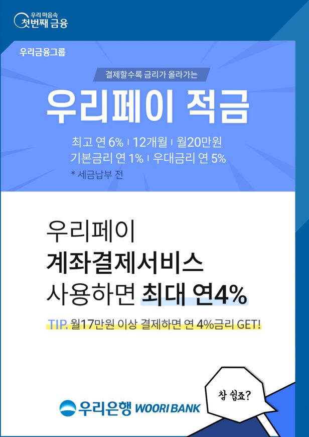 우리은행은 우리은행 거래실적과 우리페이 계좌결제서비스 이용실적에 따라 최고 연 6.0%의 고금리를 제공하는 '우리페이 적금'을 출시했다고 24일 밝혔다.