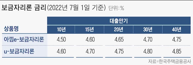 u-보금자리론 금리는 연 4.60%(만기 10년)에서 4.85%(40년)가 적용된다. 전자약정 등 온라인으로 신청하는 아낌e-보금자리론은 이보다 0.1%포인트 낮은 연 4.50%(10년)에서 4.75%(40년)의 금리를 기록했다.