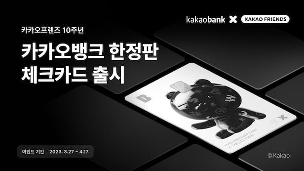 카카오뱅크는 '단 10만 장, 한정판 그 이상의 아트피스'를 메인 테마로 한정판 프렌즈 체크카드 발급 프로모션을 진행한다. 이벤트 기간은 3월 27일부터 4월 17일로 3주 간이다.