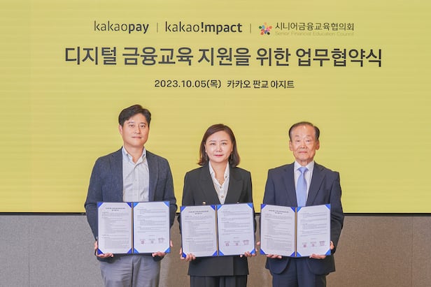 카카오페이∙카카오임팩트∙시니어금융교육협의회는 지난 5일 디지털 금융교육 지원의 첫 시작으로 '모두를 위한 디지털 금융교육 3자 협약'을 체결했다. 협약식에는 신원근 카카오페이 대표, 육심나 카카오임팩트 사무총장, 윤덕홍 시니어금융교육협의회 회장 등이 참석했다.