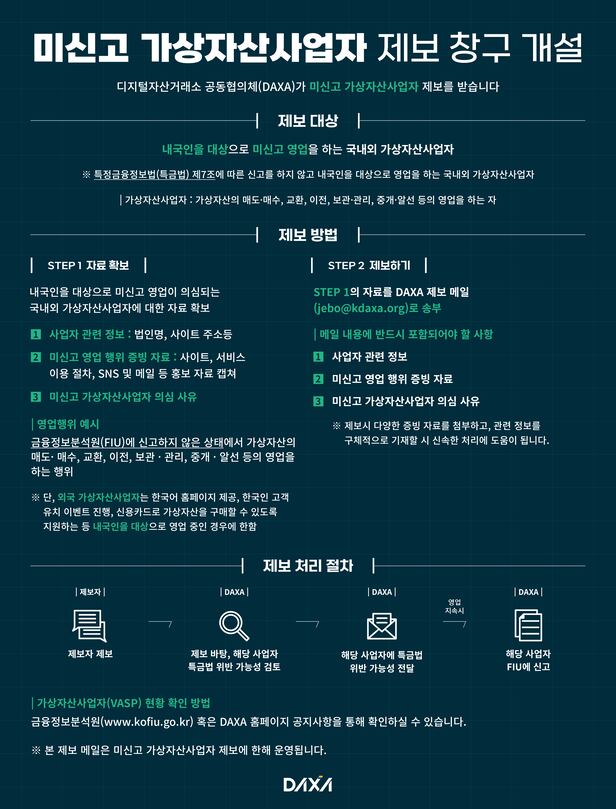 디지털자산거래소 공동협의체(DAXA)는 금융정보분석원(FIU)과 협조해 미신고 가상자산사업자에 대한 제보 접수 업무를 4일부터 개시했다고 이날 밝혔다.