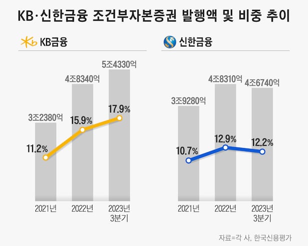 22일 금융권과 한국신용평가에 따르면 올해 3분기 말 기준 KB금융지주와 신한금융지주의 코코본드 발행액은 각각 5조4330억원, 4조6740억원으로 전체 자본 중 각각 17.9%, 12.2% 비중을 차지한다. 국내 양대 금융지주인 KB금융과 신한금융의 자본 조달 구조에서 코코본드가 차지하는 비중은 늘고 있는 추세다. KB금융은 2021년 말(11.2%) 대비 6.7%포인트, 신한금융은 같은 기간 1.5%포인트 늘었다.