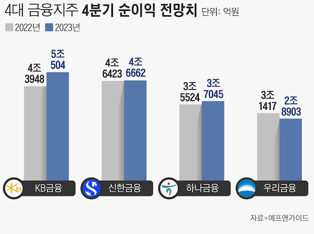 올해 4대 금융지주(KB·신한·하나·우리금융지주)가 사상 최대 당기순이익을 기록할 것으로 전망된다. 고금리 환경에서 이자 이익이 증가한 덕분이다. KB금융은 사상 첫 연간 순이익 5조원을 돌파할 것이란 관측까지 나오만, 우리금융의 경우 전년 대비 마이너스 성장이 예상된다. 금융지주가 올해 '역대급' 실적을 이어간 가운데 시장에서는 내년부터 실적 잔치가 끝나고 순익 감소세가 나타날 것으로 보고 있다.