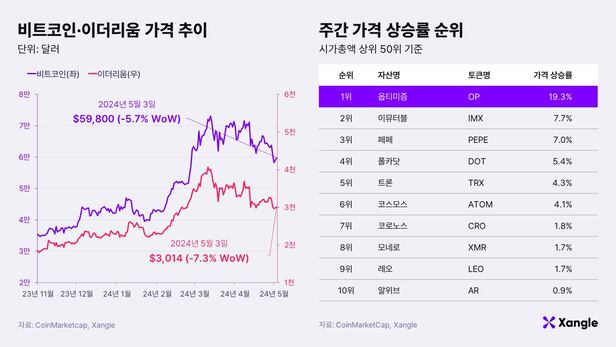 지난 3일 비트코인 가격은 전주 대비 5.7% 하락한 6만달러 수준에서 거래됐다. 비트코인은 한때 5만6000달러에 거래되며 고점(7만3000달러) 대비 20% 넘게 급락했으나, 저가 매수세가 들어오며 반등했다. 같은 기간 이더리움 가격은 지난 한 주 동안 7.3% 하락한 3000달러 수준에서 거래됐다. BNB는 7.1%, 솔라나는 1.4%, 리플은 1.2% 하락했다.