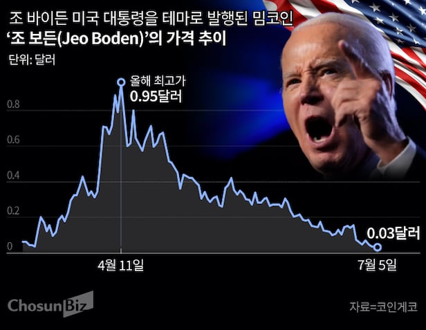 가상자산 통계 분석 플랫폼인 코인게코에 따르면 조 바이든 미국 대통령을 테마로 만들어진 밈코인 '조 보든(Jeo Boden)'은 지난 5일 오후 3시 기준 0.03달러에 거래됐다. 올해 들어 최고가였던 지난 4월 11일 0.95달러와 비교해 약 3개월 만에 30분의 1 수준으로 폭락한 것이다.
