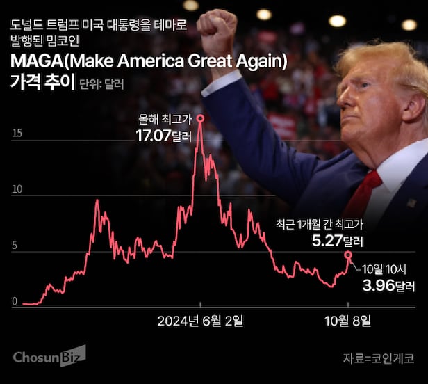 10일 가상자산 통계분석 플랫폼인 코인게코에 따르면 도널드 트럼프 전 미국 대통령을 테마로 한 정치 밈코인 'MAGA'의 가격은 지난 8일 5.27달러를 기록했다. 지난달 24일 이 코인은 1.71달러에 거래됐다. 불과 보름 만에 가격이 3배 넘는 수준으로 급등한 것이다.