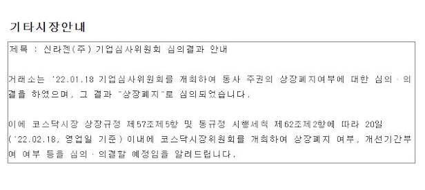 앞서 한국거래소는 전날 기업심사위원회(기심위)를 개최해 신라젠 주권 상장폐지 여부에 대해 심의, 의결했고, 그 결과 '상장폐지'가 결정됐다고 밝혔다.