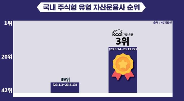 KCGI자산운용은 지난 8월 14일 메리츠자산운용에서 현재 사명으로 간판을 바꿔 달았다. 이번에 새 출범 100일을 맞아 펀드 평가사 KG제로인이 제공하는 공모 자산운용사의 국내 주식형 펀드 기간별 수익률 데이터를 연초부터 8월 14일까지, 이후부터 11월 22일까지로 나눠 비교했다.