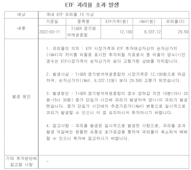 미래에셋자산운용 관계자는 "ETF는 이상 괴리율이 3번 연속 발생하면 투자유의종목으로 지정되고 이후 추가로 2번 연속 발생되면 거래가 정지된다"며 "해당 ETF의 경우 괴리율 급등 하루 만에 문제가 해소돼 현재는 정상 거래 중"이라고 말했다.