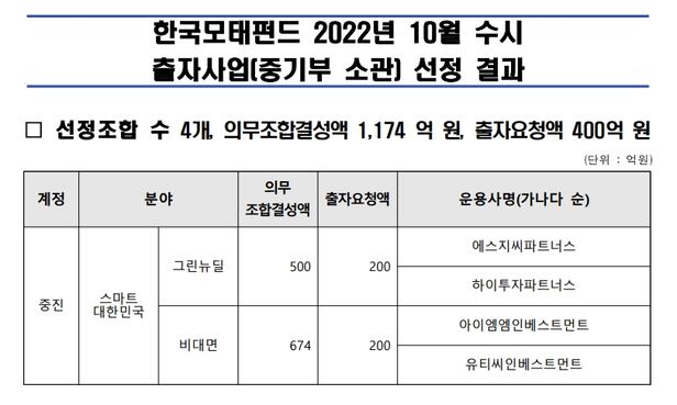 한국벤처투자가 진행하는 모태펀드의 중소벤처기업부 소관 10월 수시 출자사업 스마트 대한민국 분야에 4곳의 벤처캐피탈(VC)이 위탁운용사(GP)로 선정됐다. 이번 수시출자는 올해 2022년 정시출자 사업에서 운용사로 선정된 소프트뱅크벤처스와 송현인베스트먼트가 운용권을 반납하면서 재출자가 이뤄진 것이다.