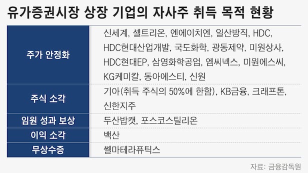 올해 자사주 취득을 발표한 코스피 기업 24곳 중 단 4곳만이 자사주를 소각한다고 밝혔다. 그마저도 기아는 매입한 주식의 절반만 소각한다는 계획이다. 주가의 안정화를 위해 자사주를 매입한다는 기업이 16곳으로 가장 많았으며, 임원 성과 보상 2곳, 이익 소각과 무상수증이 각각 1곳이었다. 소각 외에는 잠재 매도물량(오버행) 부담이 있는 것이다.