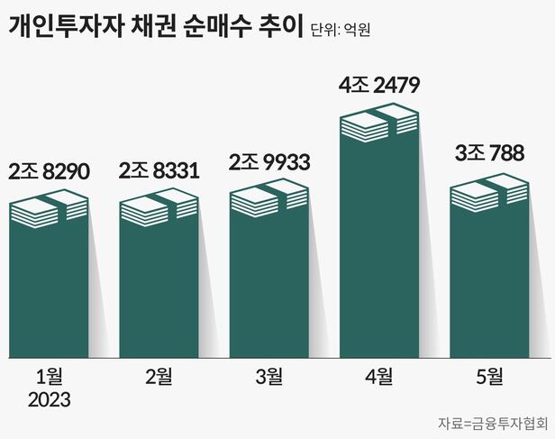 6일 금융투자협회에 따르면 올해 들어 지난달까지 개인들의 채권 투자 규모는 15조9821억원으로 집계됐다. 이는 전년 동기(3조7380억원)보다 4배 넘게 늘어난 것이다. 개인들은 4월과 지난달엔 각각 4조2479억원, 3조788억원을 순매수하며 지난해 9월 이후 처음으로 두 달 연속 3조원을 넘겼다. 펀드평가사인 KG제로인에 따르면 채권형 상장지수펀드(ETF)의 지난달 설정액 또한 27조6557억원으로 연초(21조5907억원) 대비 6조원 이상 늘었다.