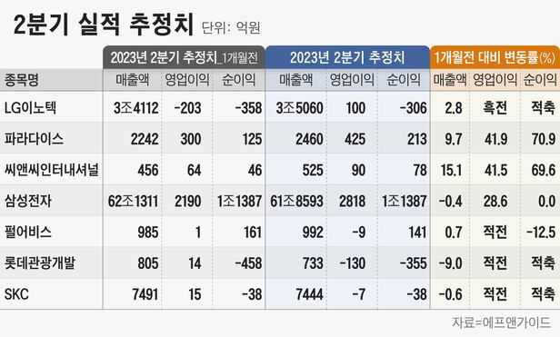 가장 눈에 띄는 곳은 LG이노텍(011070)이다. 1개월 전에는 영업손실을 낼 것으로 예상했지만, 최근에는 흑자전환할 것으로 보고 있다. LG이노텍의 2분기 예상 영업이익은 100억원, 당기순손실은 306억원으로 나타났다. 지난해 2분기와 비교하면 영업이익은 96.5% 급감한 수준이고, 순이익은 적자로 돌아서는 수준이다. 하지만 적자 가능성 때문에 기대치가 낮아져 있어 실적 발표 이후 긍정적인 주가 흐름이 나타날 수 있다는 것이 전문가들의 분석이다.