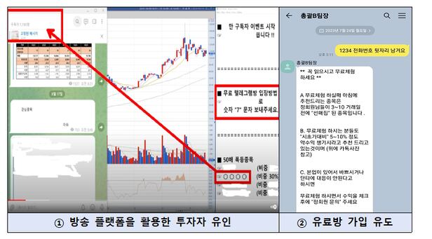 방송 플랫폼을 이용해 무료로 투자 정보를 제공한다며 고객의 개인 연락처를 확보한 후 일대일로 투자 자문을 한 B사도 적발됐다. 금감원은 B사에 대해 미등록 투자 자문 혐의로 경찰청에 수사를 의뢰했다.